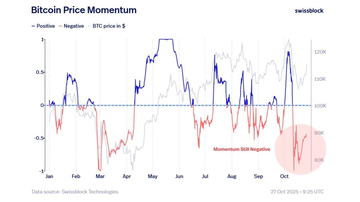 Swissblock объяснил, что так как импульс цены остается отрицательным после вспышки падения 11 октября, теперь ключ заключается в “инициации импульса”, добавив: