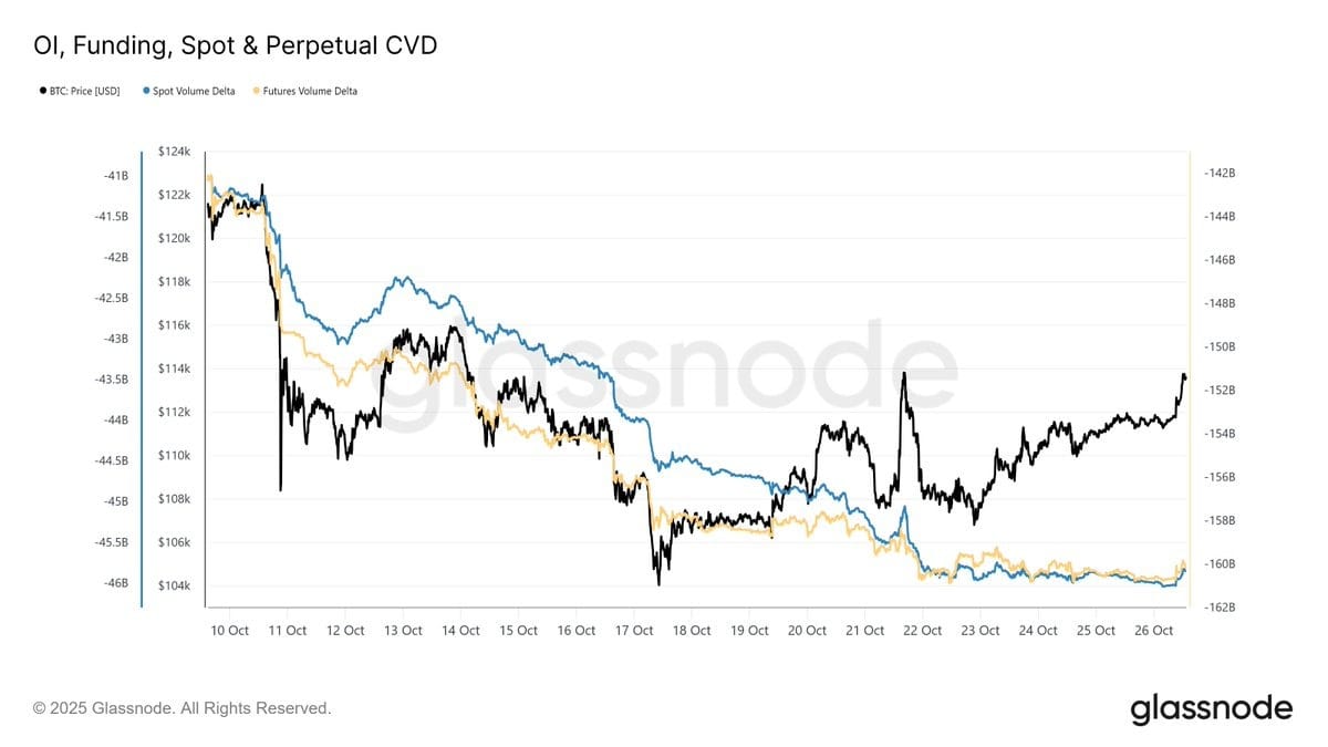 График ниже показывает, что спотовый совокупный объемный дельта (CVD) и CVD бессрочных контрактов остаются отрицательными, но снижаются последние две недели.