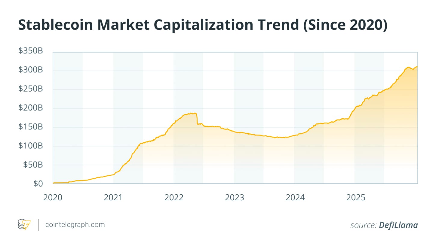 12 декабря 2025 года рынок стабильных монет достиг ключевой отметки в $310 миллиардов. Это составляет рост на 70% всего за один год. Такой рост не является просто очередным пузырем, связанным с криптовалютами; это указывает на кардинальные изменения в том, как цифровые активы начинают использоваться по всему миру.