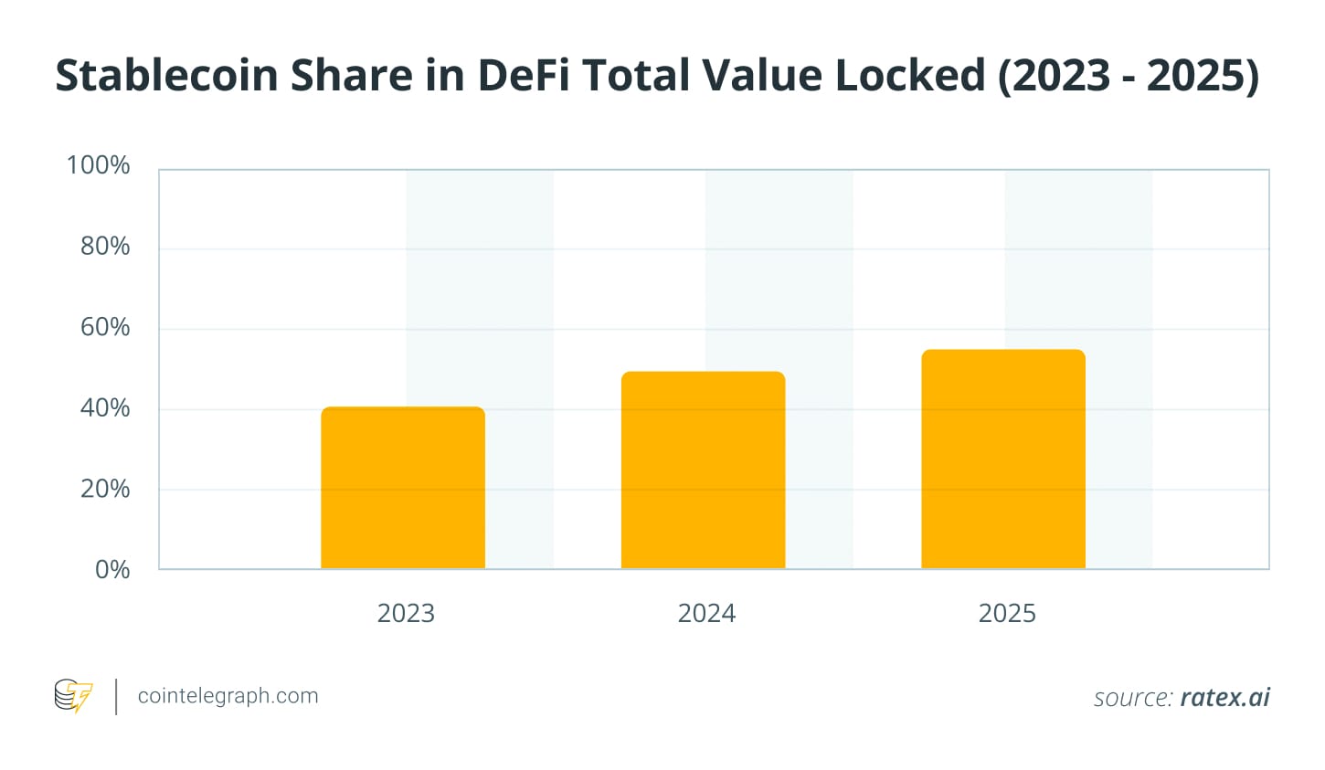 Знаете ли вы? В 2025 году более половины общего значения заблокированных средств в DeFi приходится на стабильные монеты, делая их основным обеспечением и учетной единицей для многих ончейн-протоколов кредитования и ликвидности.