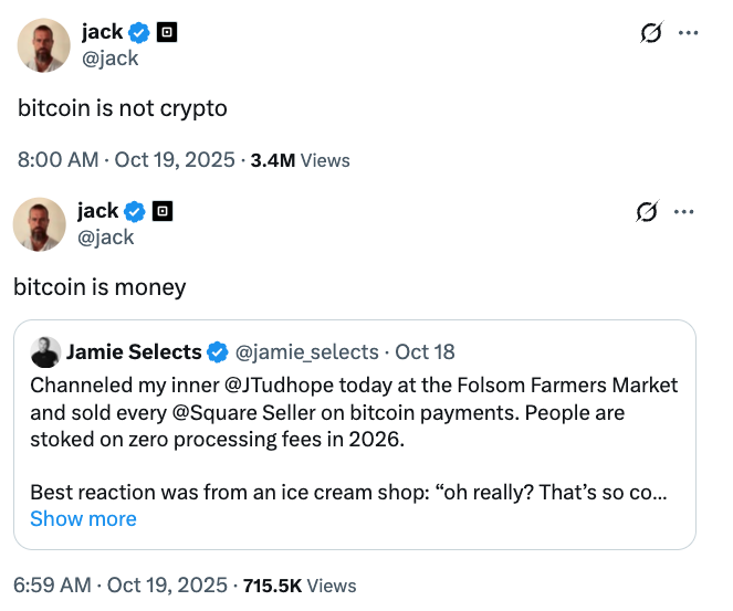 В воскресенье Дорси опубликовал в X краткое сообщение «Биткойн — это не криптовалюта», вызвавшее более 4,000 комментариев.
