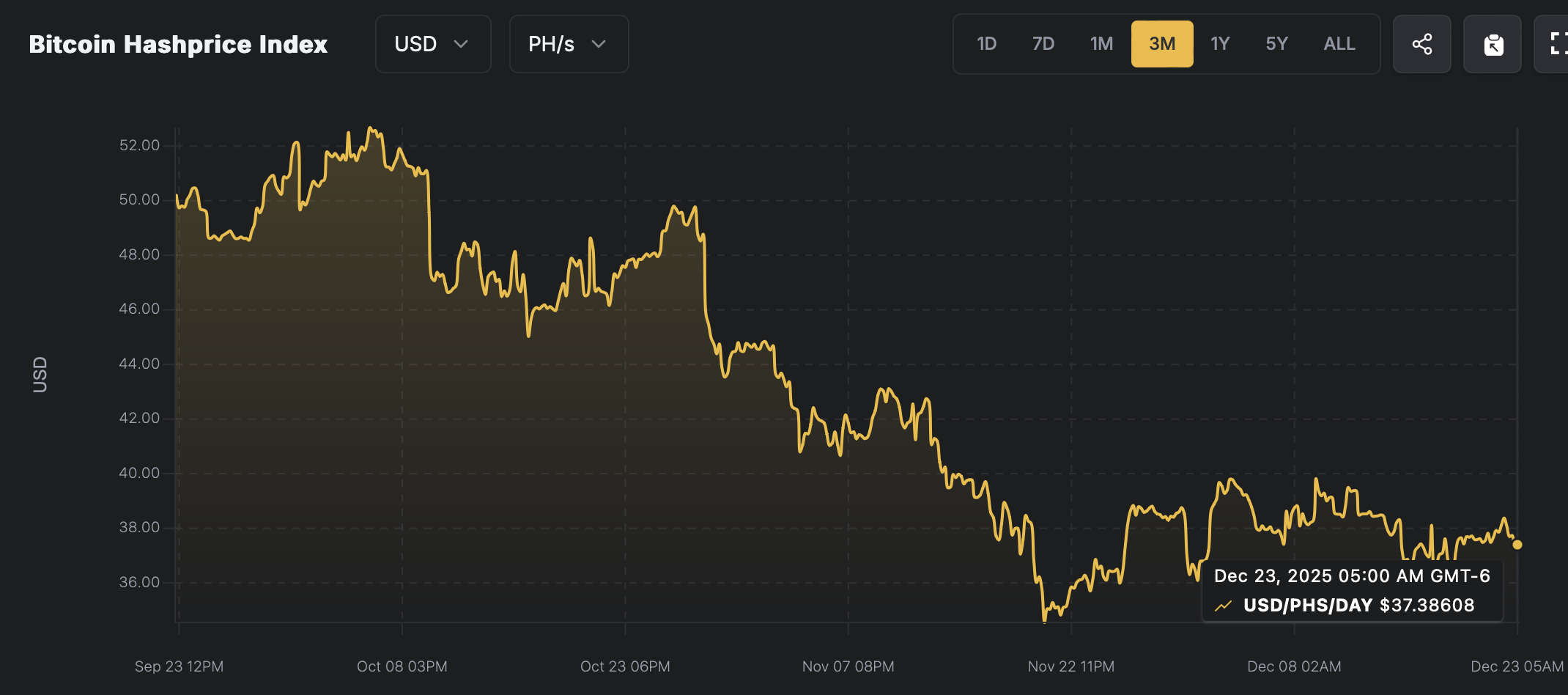 Цена на хешрейт Bitcoin, ключевой показатель дохода майнеров на единицу вычислительной мощности, удерживается ниже 40 долларов с середины ноября — уровня, который многие операторы считают точкой безубыточности. Этот спад заставляет майнинговые компании пересмотреть свои операционные модели, поскольку маржа в отрасли остаётся под давлением.