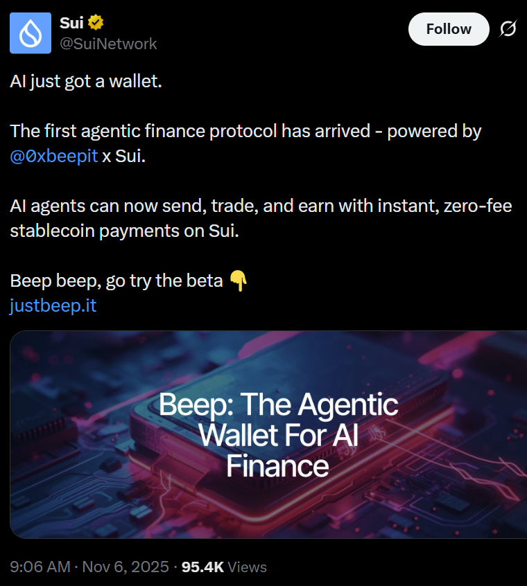 Между тем, протокол agentic finance Beep недавно запустил кошелек в сети Sui, позволяя агентам ИИ отправлять и получать стейблкоин платежи без комиссии за транзакции.
