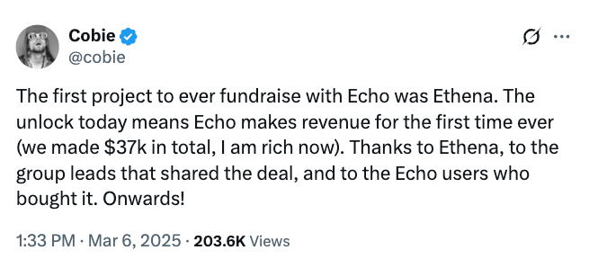 По словам Cobie, Ethena была первым проектом, который собрал финансирование с использованием Echo, акцентируя внимание платформы на инвестировании на ранних стадиях.