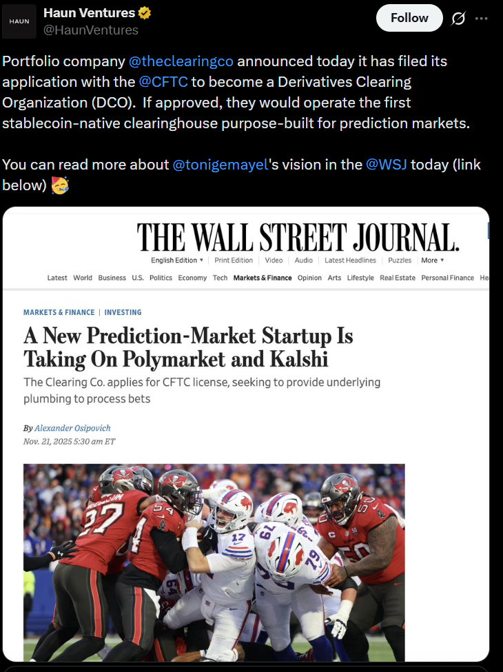 Сделка знаменует быстрое развитие The Clearing Company, который был основан в этом году и привлек финансирование $15 миллионов от Coinbase Ventures, Union Square Ventures, Haun Ventures и других венчурных компаний и частных инвесторов.