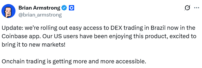 Coinbase расширяет свою платформу децентрализованной биржи, называемую «DeFi Mullet», в Бразилии, предоставляя доступ к десяткам тысяч токенов, не выходя из приложения Coinbase.
