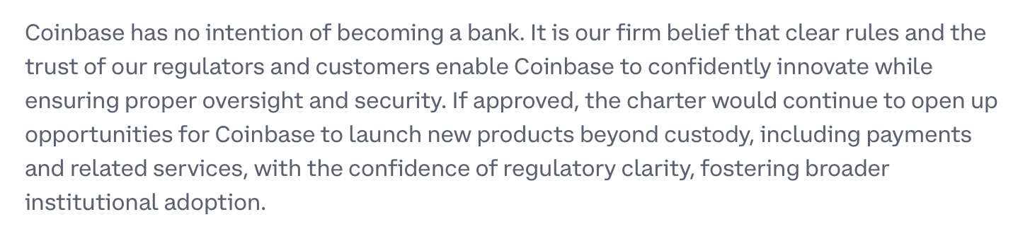 Coinbase подала аналогичную заявку в агентство 3 октября. В одном из своих блогов, компания заявила, что, хотя она «не намерена становиться банком», лицензия позволит запустить новые продукты «с уверенностью в отношении регуляторной ясности».