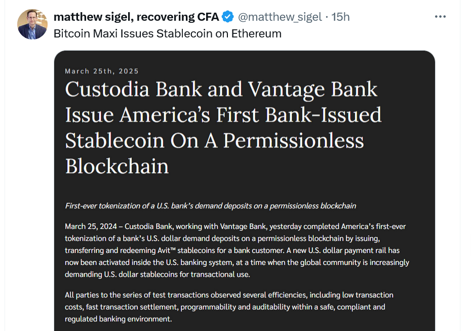 25 марта Custodia объявила, что они токенизировали долларовые депозитные счета до востребования и осуществили эмиссию, перевод и обмен стейблкоина "Avit" на Ethereum с использованием стандарта токенов ERC-20.