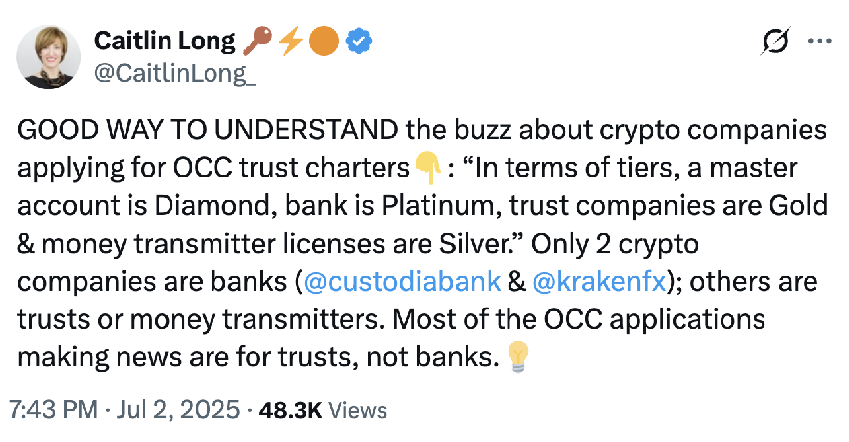 «По уровню значимости счет в ФРС — это Какой Алмаз, банк — Платина, трастовые компании — Золото, а лицензии на денежные переводы — Серебро,» заявила основатель и CEO Custodia Bank Лонг в июле, добавив, что Custodia и Kraken являются «единственными двумя криптовалютными компаниями», которые являются банками.
