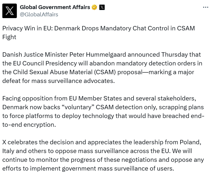 Глобальная команда по правительственным связям платформы X заявила в субботу, что отказ Дании — это «серьезное поражение для сторонников массового наблюдения», и платформа будет «продолжать следить за ходом этих переговоров и противостоять любым попыткам внедрения массового правительственного наблюдения за пользователями».