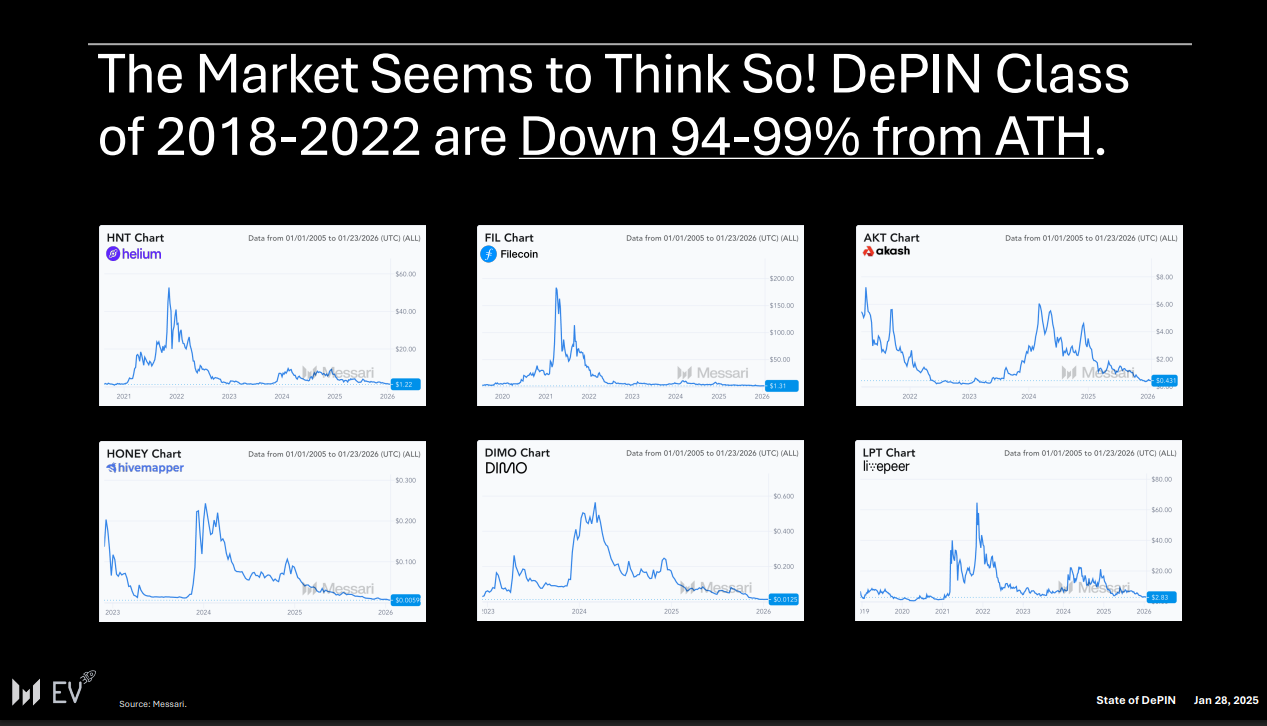 В отчете отмечается, что токены DePIN «волны 2018–2022» остаются на 94–99% ниже исторических максимумов. При этом ведущие проекты уже показывают подтверждаемую регулярную выручку и торгуются примерно по мультипликаторам 10–25x от выручки — в Messari считают такие оценки заниженными с учетом темпов роста.