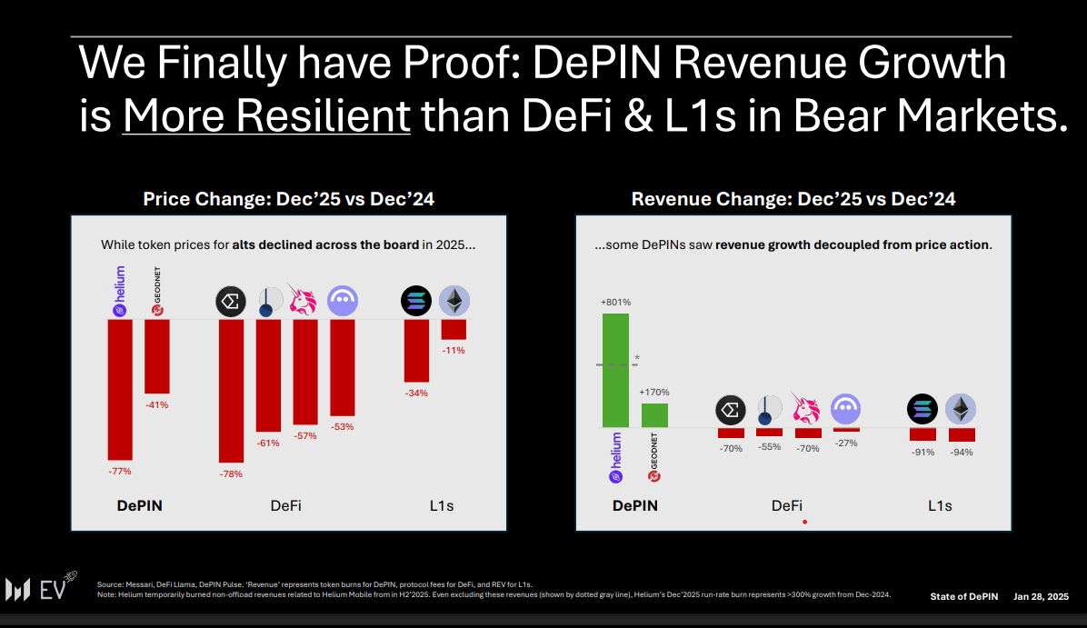 Один из ключевых выводов отчета: рост выручки DePIN оказался устойчивее, чем у DeFi и L1, в условиях текущего медвежьего рынка.