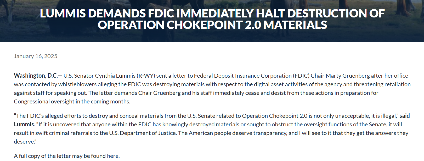 Вопросы дебанкинга обострились в январе, когда в офис Ламмис обратился анонимный осведомитель, утверждающий, что Федеральная корпорация по страхованию вкладов (FDIC) «уничтожает документы», связанные с Операцией Chokepoint 2.0.