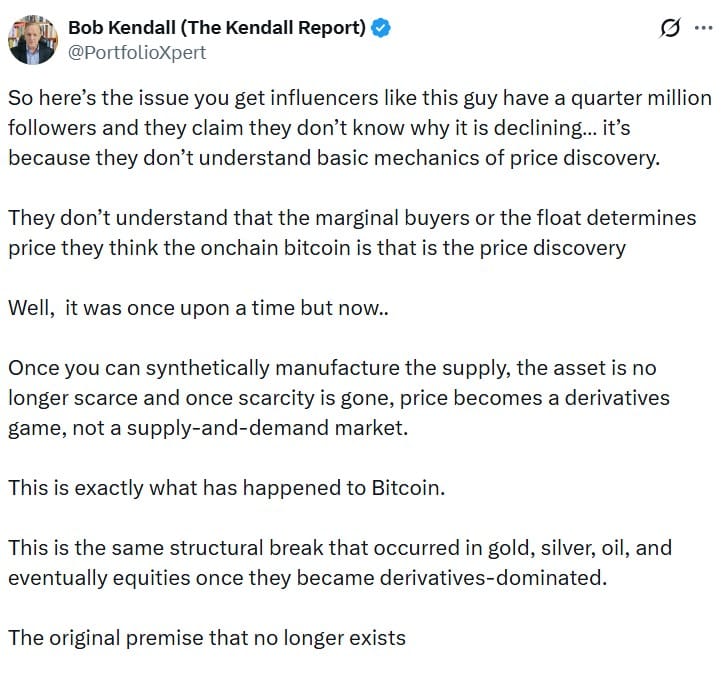 Автор «The Kendall Report» Роберт Кендалл связал резкие просадки начала 2026 года с тем, что появление расчетных фьючерсов, ETF и других инструментов якобы «убило» логику оценки BTC, основанную на фиксированном предложении.