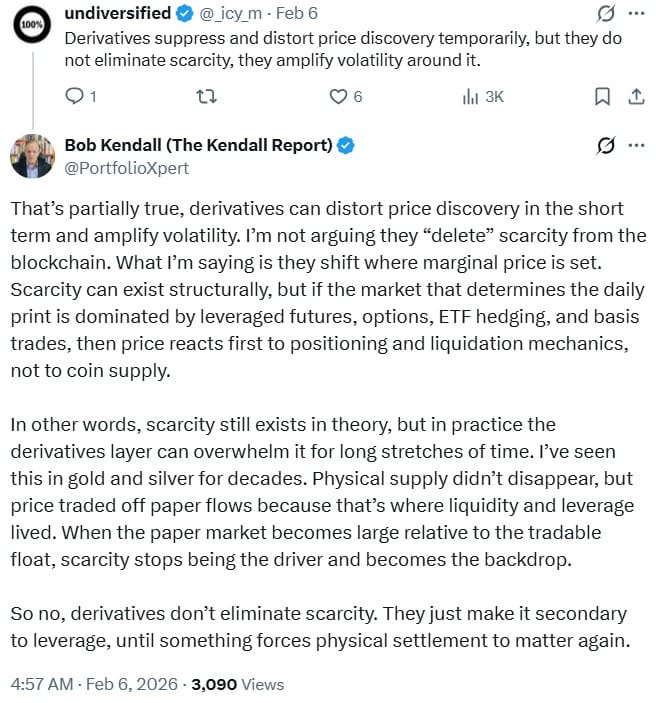 Сам Кендалл, отвечая критикам, уточнил позицию: он не утверждает, что деривативы удаляют дефицит из блокчейна, но считает, что они смещают место, где формируется предельная цена.