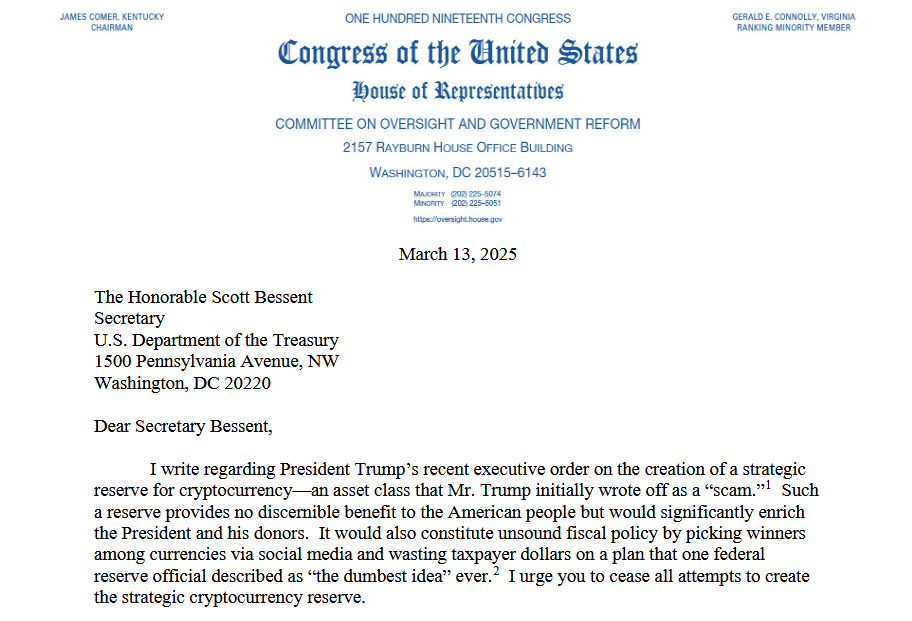 Член палаты представителей Джеральд Э. Коннолли из Мичигана раскритиковал "резерв криптовалюты" в письме от 13 марта к министру финансов Скотту Бессенту, заявив, что он не предоставляет "никакой видимой пользы американцам", а скорее значительно обогатит президента и его доноров.