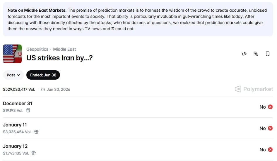 По данным Polymarket, объём торгов по ставкам на удары США по Ирану достиг $529 млн. В прошлом месяце один из трейдеров Polymarket, как сообщалось, заработал около $400 тыс. на удачной ставке, связанной с задержанием президента Венесуэлы Николаса Мадуро.