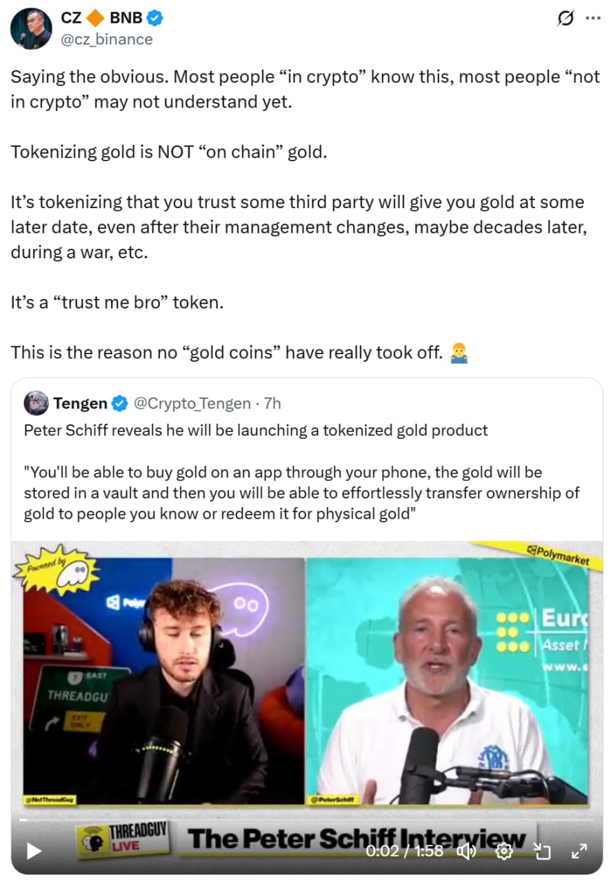 В четверг в записи на X CZ отметил, что токенизированное золото — это не "золото на блокчейне", а обещание, зависящее от хранения третьей стороной. "Это токенизация, в которой ты доверяешь, что некая третья сторона отгрузит тебе золото в будущем... даже после смены их управления, возможно десятилетиями позже, во время войны," написал он.