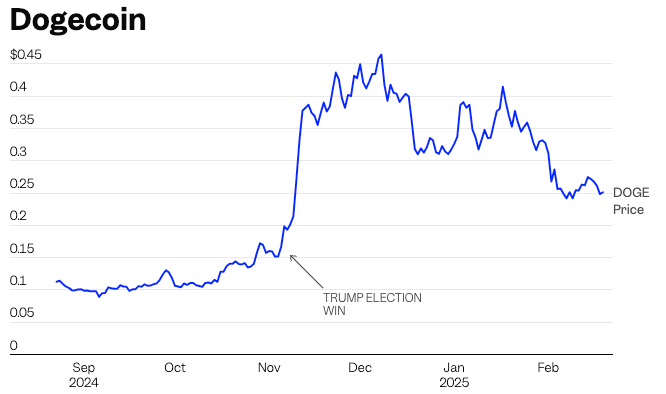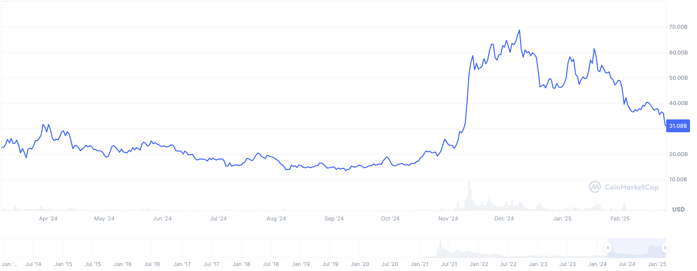 На 25 февраля 2025 года рыночная капитализация Dogecoin составляет $33 млрд (CoinMarketCap), что больше, чем у Cardano ($16 млрд), но меньше, чем у Ethereum ($350 млрд). Исторически DOGE достигал пика в $88 млрд в мае 2021 года, когда $1000, вложенные в апреле 2019 года, выросли до $142 000 к январю 2025 года (Nasdaq, 28 января 2025 года). Однако текущий спад отражает высокую спекулятивность монеты.