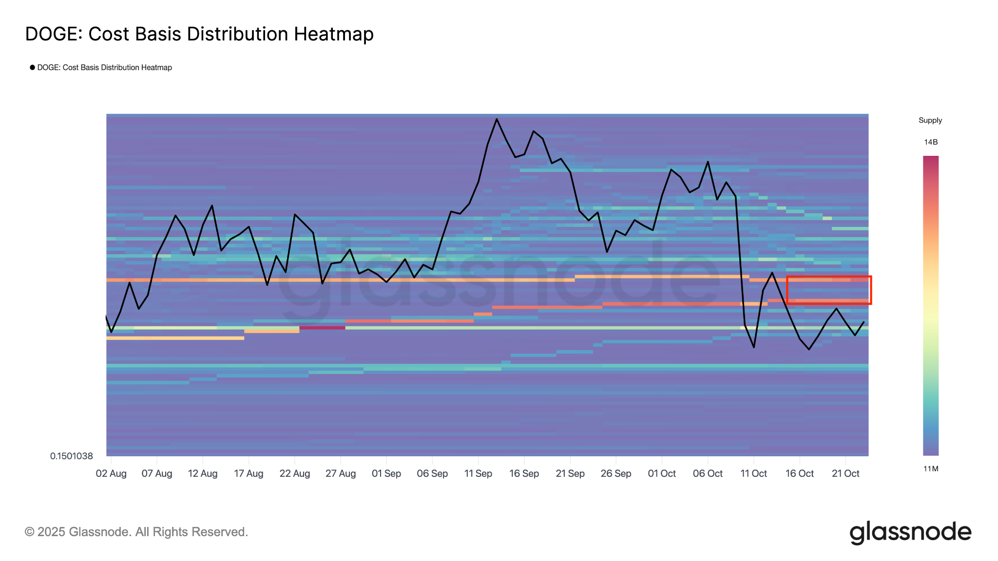 Тепловая карта распределения от Glassnode показывает, что значительное количество монет сосредоточено в диапазоне $0.20-$0.21, где недавно было приобретено почти 24.9 миллиарда DOGE, подчёркивая важность этого уровня.