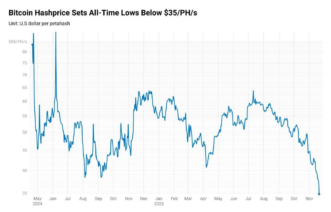Hashprice, показатель дохода майнеров за единицу вычислительной мощности, упал ниже $35 за хэш, понизившись от медианного значения в $45/PH/s, заявленного публичными майнинговыми компаниями. Это падение приближает несколько операторов к уровню безубыточности.