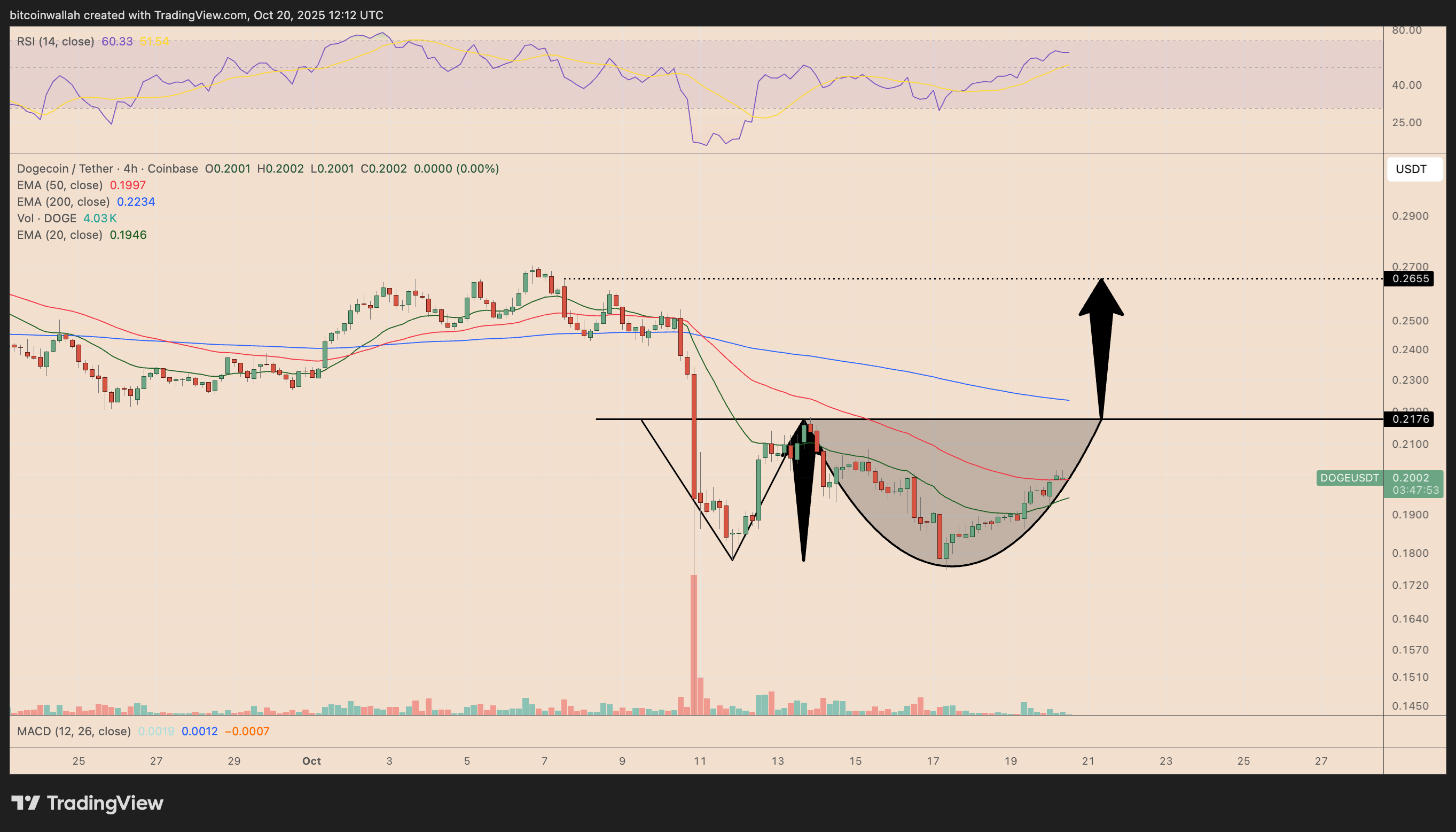 Линия шеи DOGE находится около $0.216, и подтверждённый прорыв выше этого уровня может вызвать движение к $0.260, что на 25% выше текущих цен.