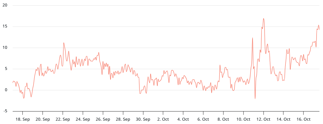 Премия на месячные фьючерсы ETH по сравнению с спотовыми рынками снизилась до 4%, что ниже 5% нейтрального порога. Чувства трейдеров уже были подорваны вспышечным крахом 10 октября, и последняя заметная бычья фаза была в начале февраля. Трейдеры эфира становятся все более сомневающимися в силе любого длинного бычьего импульса.