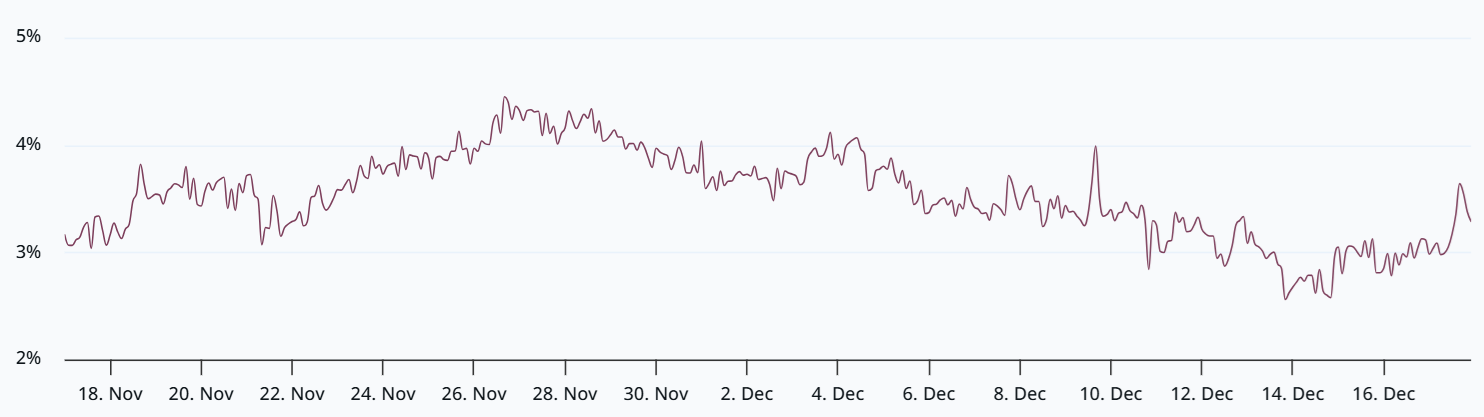 Совокупный открытый интерес по фьючерсам на эфир снизился до $28.1 миллиарда на основных биржах, с пика в $32.4 миллиарда 10 декабря. Хотя падение левереджированных позиций не автоматически указывает на медвежьи настроения, это создает давление на бычью уверенность, особенно учитывая, что ETH торгуется на 41% ниже своего исторического максимума в $4,957. Чтобы определить, контролируют ли медведи рынок, инвесторы часто обращают внимание на месячную премию фьючерсов.