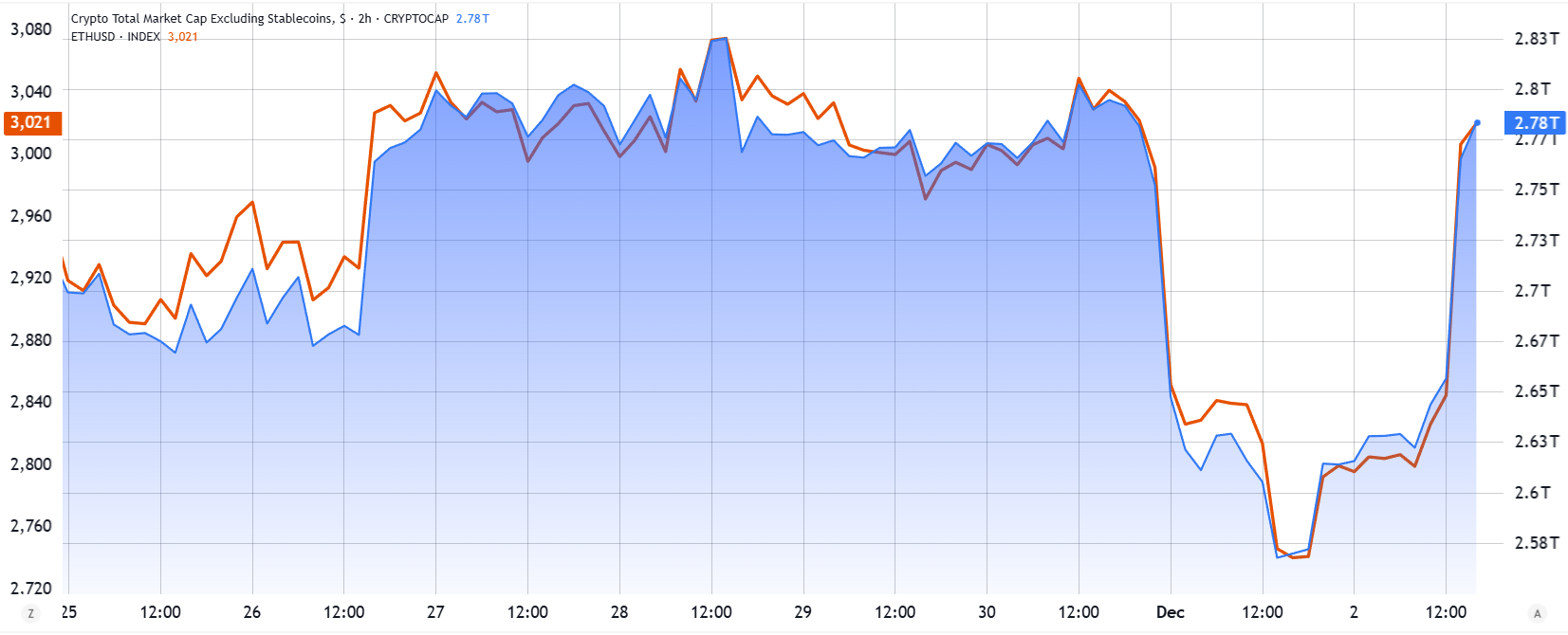 Эфириум (ETH) вырос на 8% во вторник, но застопорился около $3000, так как рынки деривативов сигнализировали о сомнениях в дальнейшем росте. Это произошло на фоне общего подъема на криптовалютном рынке, когда трейдеры оценивали высокие шансы на новый экономический стимул, особенно после стресса на рынке облигаций правительства Японии в понедельник.