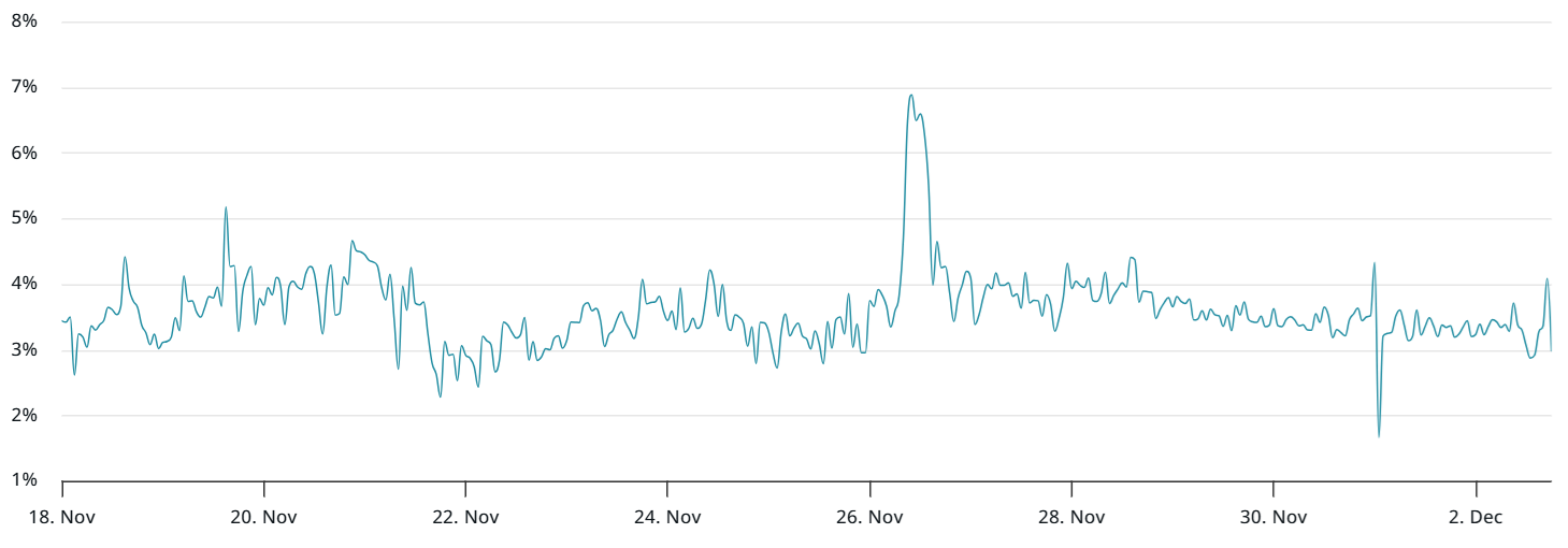 Настроения улучшились, так как инвесторы стали более уверенными в том, что денежно-кредитная политика США станет менее жесткой. Федеральная резервная система (ФРС) завершила программу сокращения баланса 1 декабря, и трейдеры ожидают снижения процентной ставки 10 декабря. Более того, крупнейшие финансовые учреждения США заметно увеличили использование репо-соглашений, добавляя ликвидность на рынки краткосрочного финансирования.