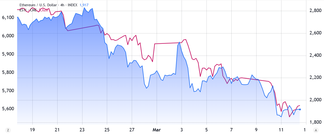 Фьючерсы S&P 500 (слева, фиолетовый) против Ether/USD (синий). Источник: TradingView