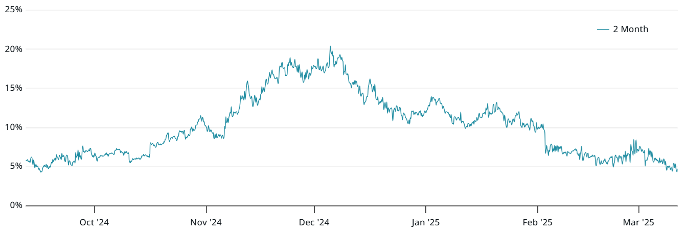 Трейдеры хотят более высокие цены для компенсации более длительных периодов расчетов, и ожидаемая аннуализированная премия (базовая ставка) в нейтральных рынках составляет 5–10%. Когда ставки падают ниже этого диапазона, например, до текущих 4,5%, это сигнализирует о слабой уверенности в восходящем тренде.