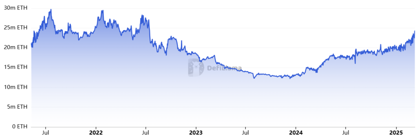Кроме того, депозиты в смарт-контракты Ethereum, измеряемые общим зафиксированным объемом (TVL), достигли своего максимума с июля 2022 года в эквиваленте ETH на 11 марта, что на 10% больше за последние две недели.
