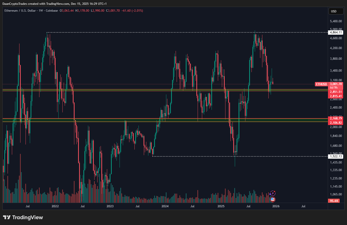 По данным из TradingView, пара ETH/USD вновь упала ниже $3,000.