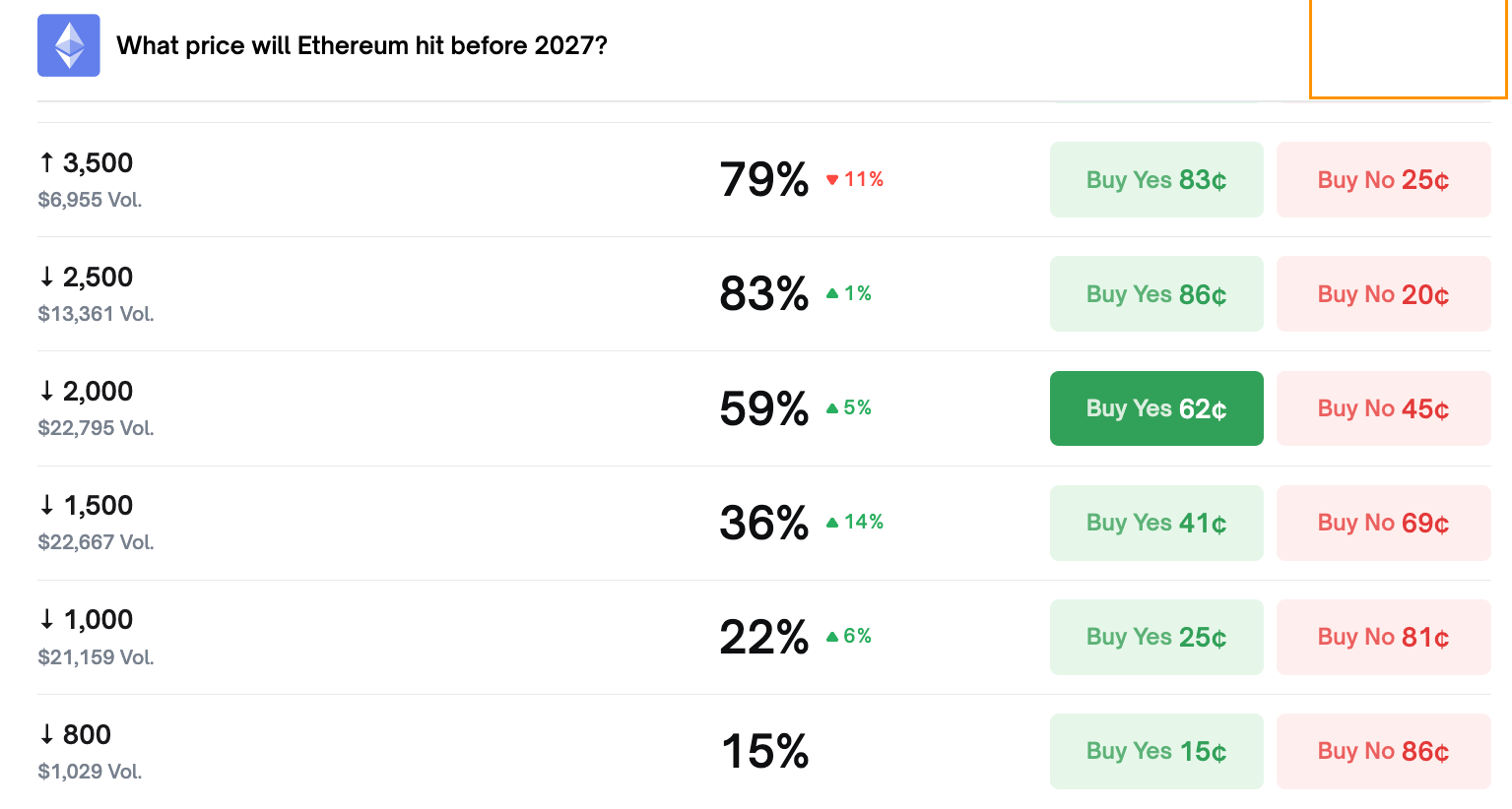 Несмотря на то, что игроки на Polymarket оценивают вероятность падения ETH до $2,000-$2,200 до конца 2025 года всего в 11%, они видят 83% шанс, что цена Ethereum снова достигнет $2,500 и 59% шанс падения до $2,000 в 2026 году.