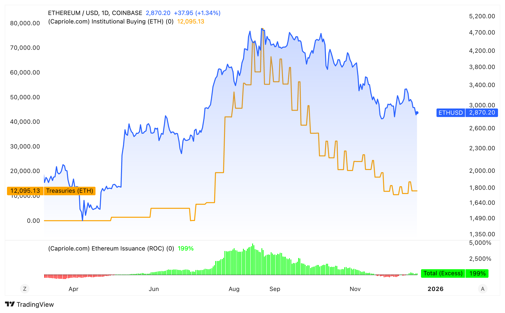 Дополнительные данные Capriole Investments показывают, что ежедневные закупки Ethereum казначейскими компаниями снизились с пика в 78,010 ETH 23 августа до 12,095 ETH в день.