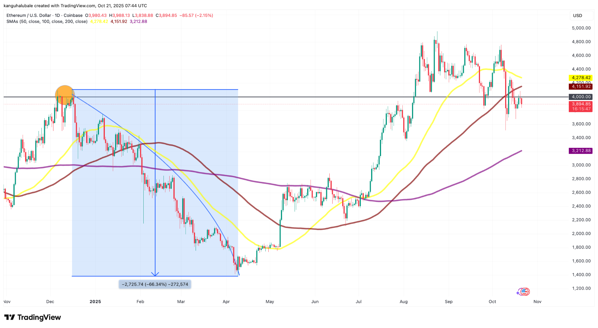 Восстановление эфириума на 16% от $3,500, достигнутых 11 октября, было приостановлено продажами вокруг психологического барьера в $4,000.