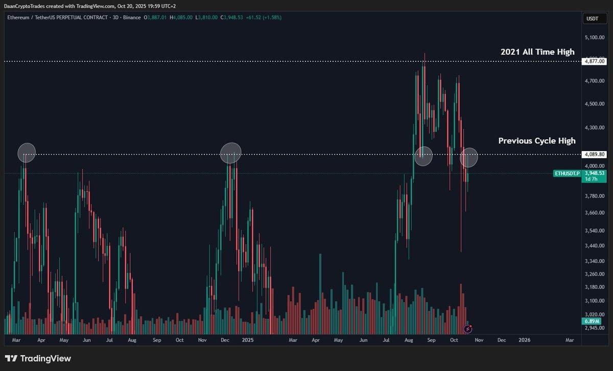 Популярный аналитик Джелле сказал, что эфириум просто снова тестирует ключевой уровень прорыва около $4,000 перед тем, как продолжить свой восходящий тренд.