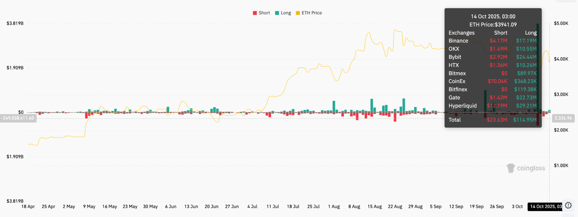 - Курс эфириума упал на 8% до $3,940, что привело к ликвидациям длинных позиций на сумму $115 миллионов.