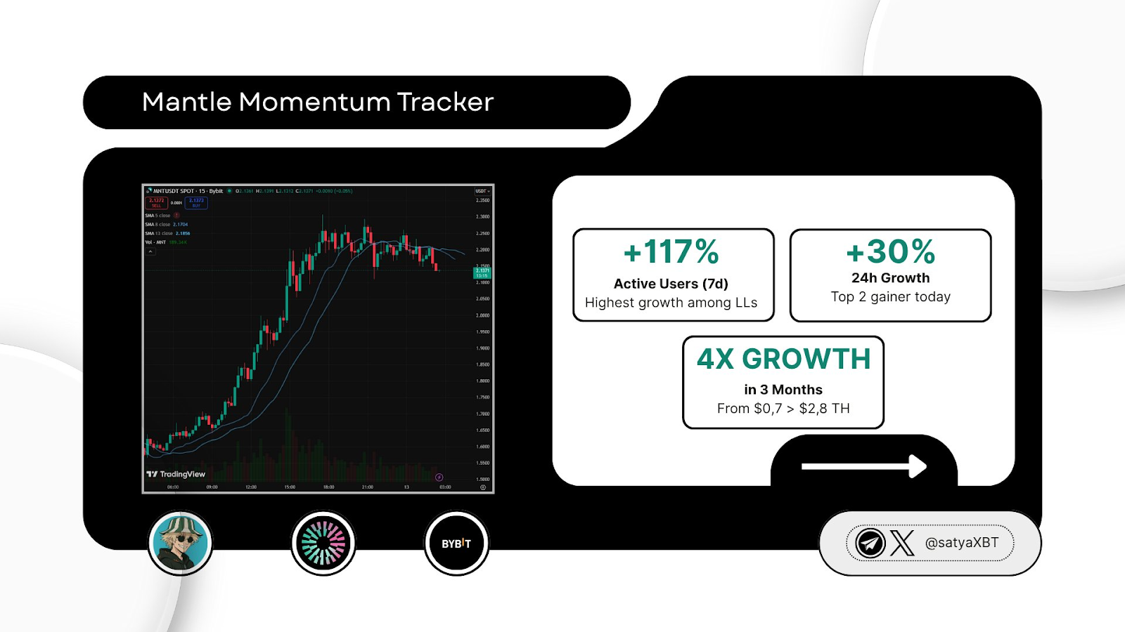 Активные адреса Mantle за неделю выросли на 117%, что ознаменовало «самый сильный рост среди всех L2», по данным эксперта по блокчейну SatyaXBT.