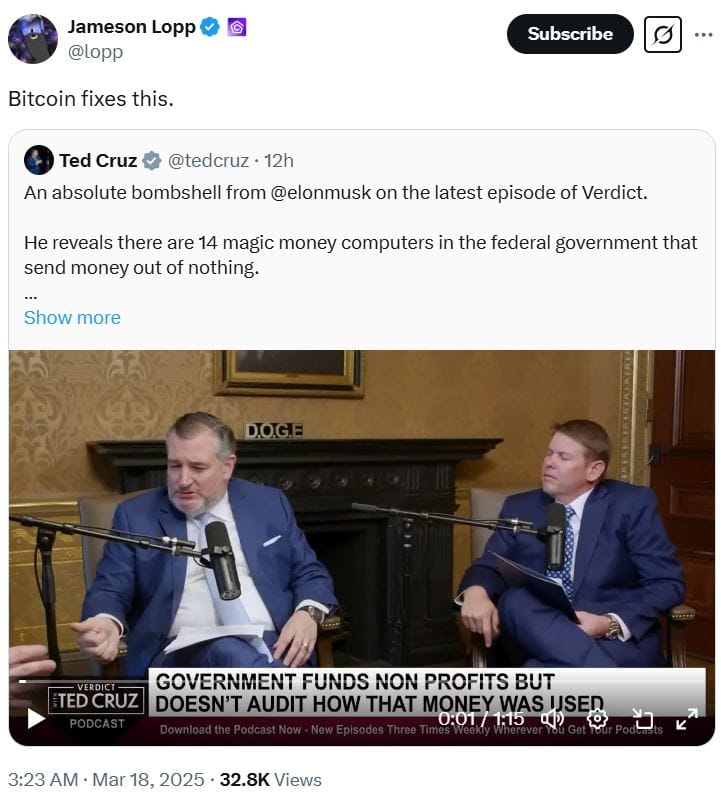 Джеймсон Лопп, глава службы безопасности в компании Casa, занимающейся хранением биткойнов (BTC), прокомментировал видео, сказав, что «биткойн решает эту проблему».