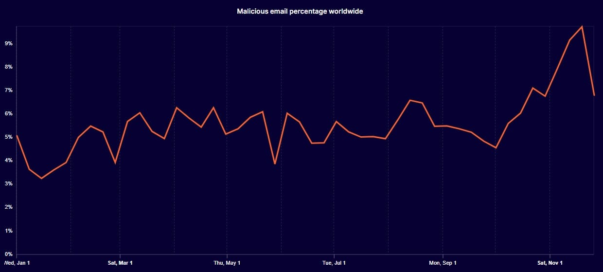 Также было выявлено, что наиболее часто используемое доменное расширение высшего уровня (TLD) было «.christmas», откуда исходит 92,7% вредоносных писем и 7,1% спама.