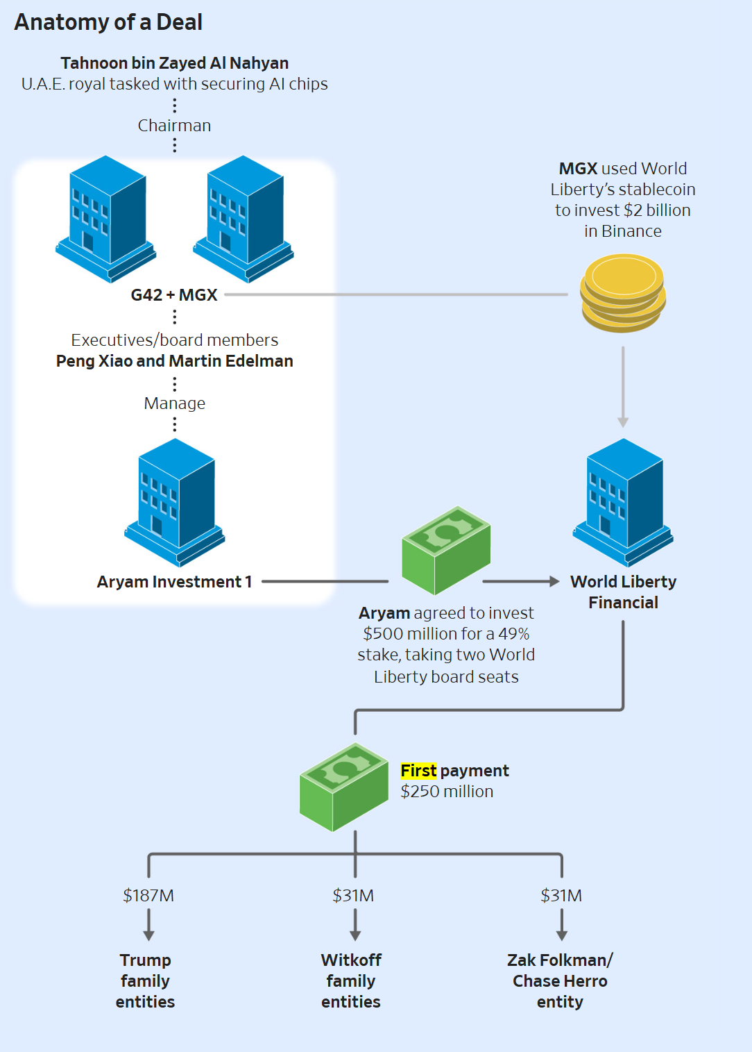 WSJ также пишет, что руководители G42 помогали управлять Aryam Investment 1 и получили места в совете директоров World Liberty в рамках сделки, сделав Aryam крупнейшим внешним акционером стартапа. За несколько недель до объявления рамочного соглашения США и ОАЭ по чипам другая структура под руководством Тахнуна — MGX — якобы использовала стейблкоин World Liberty для завершения инвестирования $2 млрд в Binance.