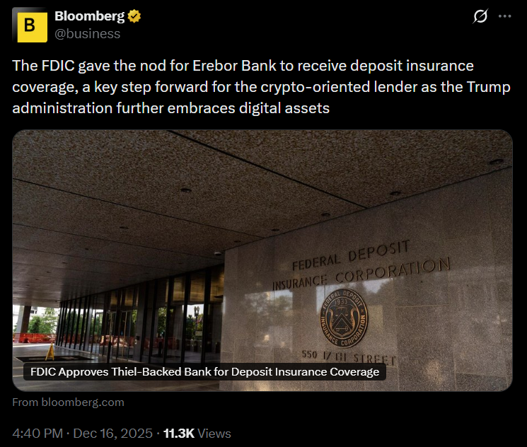 На прошлой неделе заявка Erebor на страхование депозитов была одобрена Федеральной корпорацией по страхованию депозитов (FDIC), она действует в течение 12 месяцев и истечет, если банк официально не будет создан или FDIC не предоставит продление.