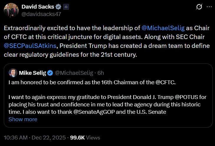 Его комментарии прозвучали после изменений в руководстве CFTC, включая кадровые перестановки с участием Майка Селига, что подчеркивает ожидания более определенной регуляторной инфраструктуры для цифровых активов.