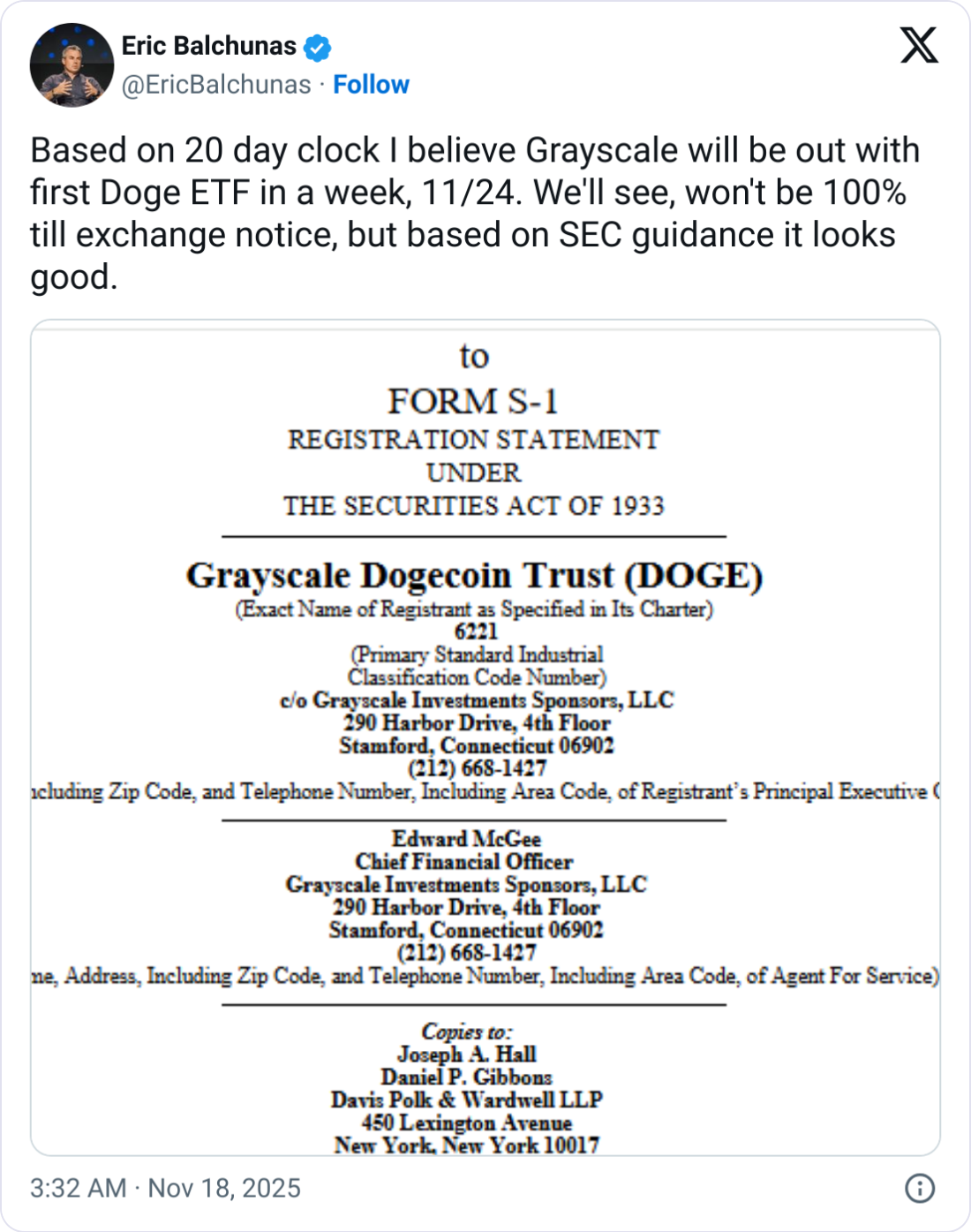 Балчунас сказал, что ожидает запуск Dogecoin (DOGE) ETF от Grayscale 24 ноября, исходя из измененного регуляторного отчета, поданного ранее в этом месяце, который дал старт 20-дневному периоду, в течение которого он может быть запущен, если SEC не ответит.