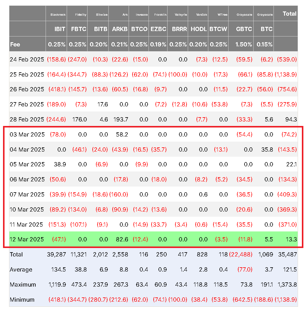 Согласно Sosovalue, совокупные чистые притоки BTC-ETF подтвердили недавний приток в размере $13,3 млн 12 марта, сигнализируя о паузе в оттоках ETF на биткоин.
