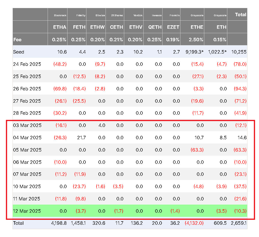 По состоянию на 12 марта спотовые биткоиновые ETF привлекли $35,4 млн на протяжении двух дней, согласно данным Farside Investors. Тем временем, спотовые ETF на эфир зафиксировали приток только один раз, привнеся $14,6 млн 4 марта.