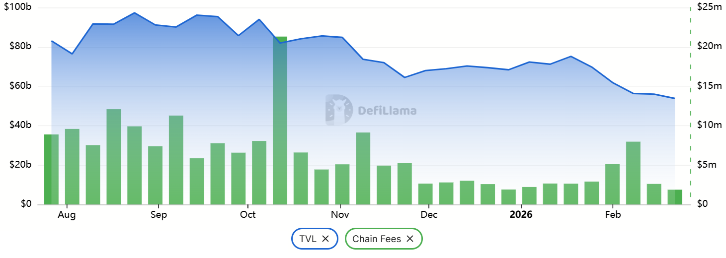 Совокупная стоимость заблокированных средств (TVL) в сети Ethereum снизилась до $51 млрд — это минимальный уровень с мая 2025 года. Из-за меньшего числа депозитов в децентрализованные приложения (DApps) упали и сетевые комиссии: за последние 30 дней они составили $13,7 млн, тогда как в конце 2025 года среднее значение было около $33 млн. Трейдеры опасаются, что спрос на обработку данных в сети ETH в ближайшее время может не восстановиться.