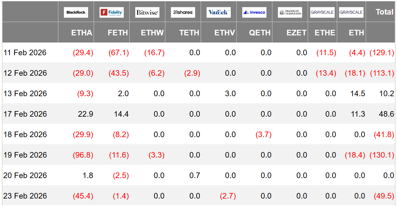 Американские ETF на Ether зафиксировали чистый отток $405 млн с 11 февраля, из-за чего общий объем активов под управлением снизился до $12,4 млрд. Это произошло на фоне роста цен на золото выше $5 150. По данным gold.org, золотые ETF привлекли $822 млн за неделю, завершившуюся 20 февраля.